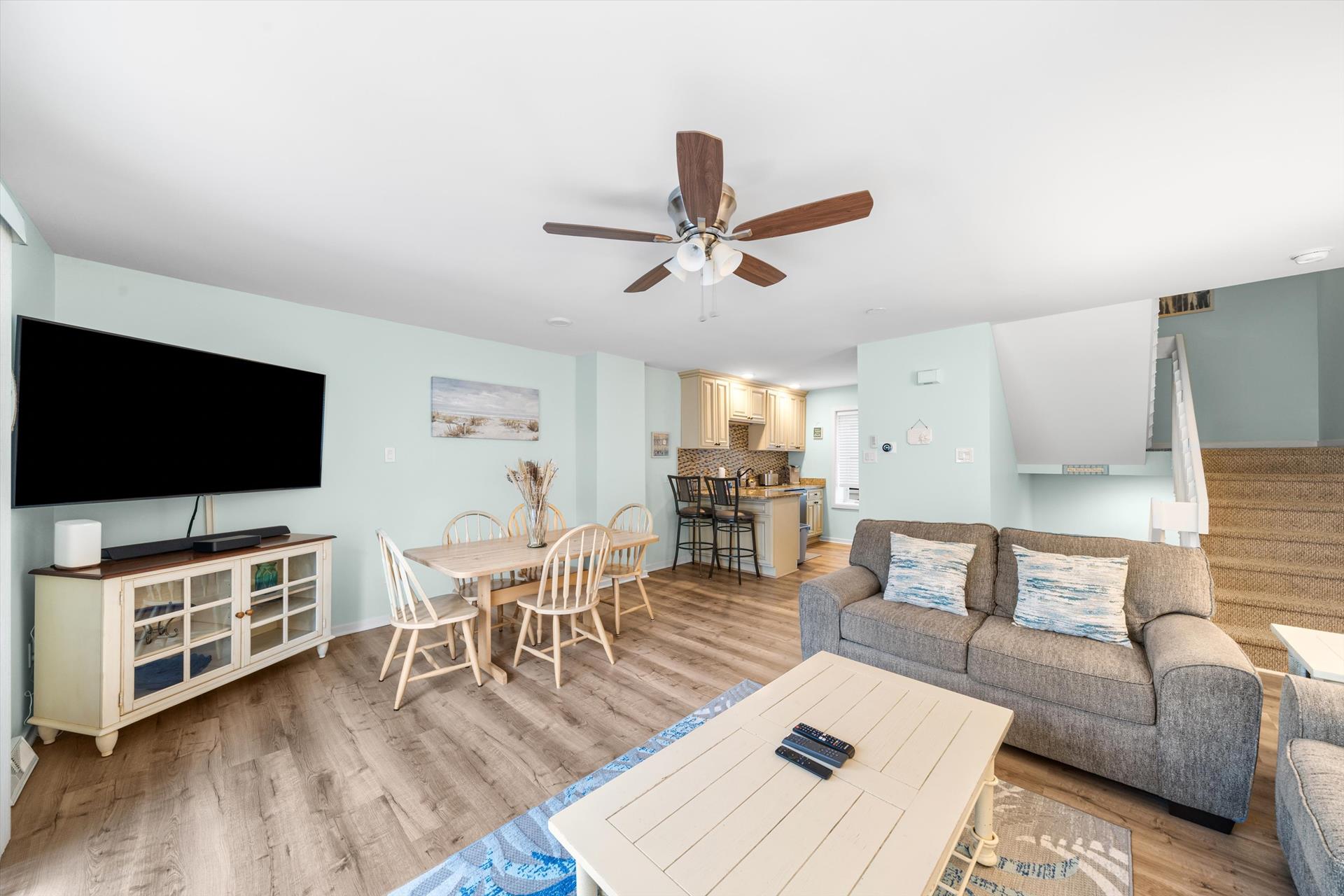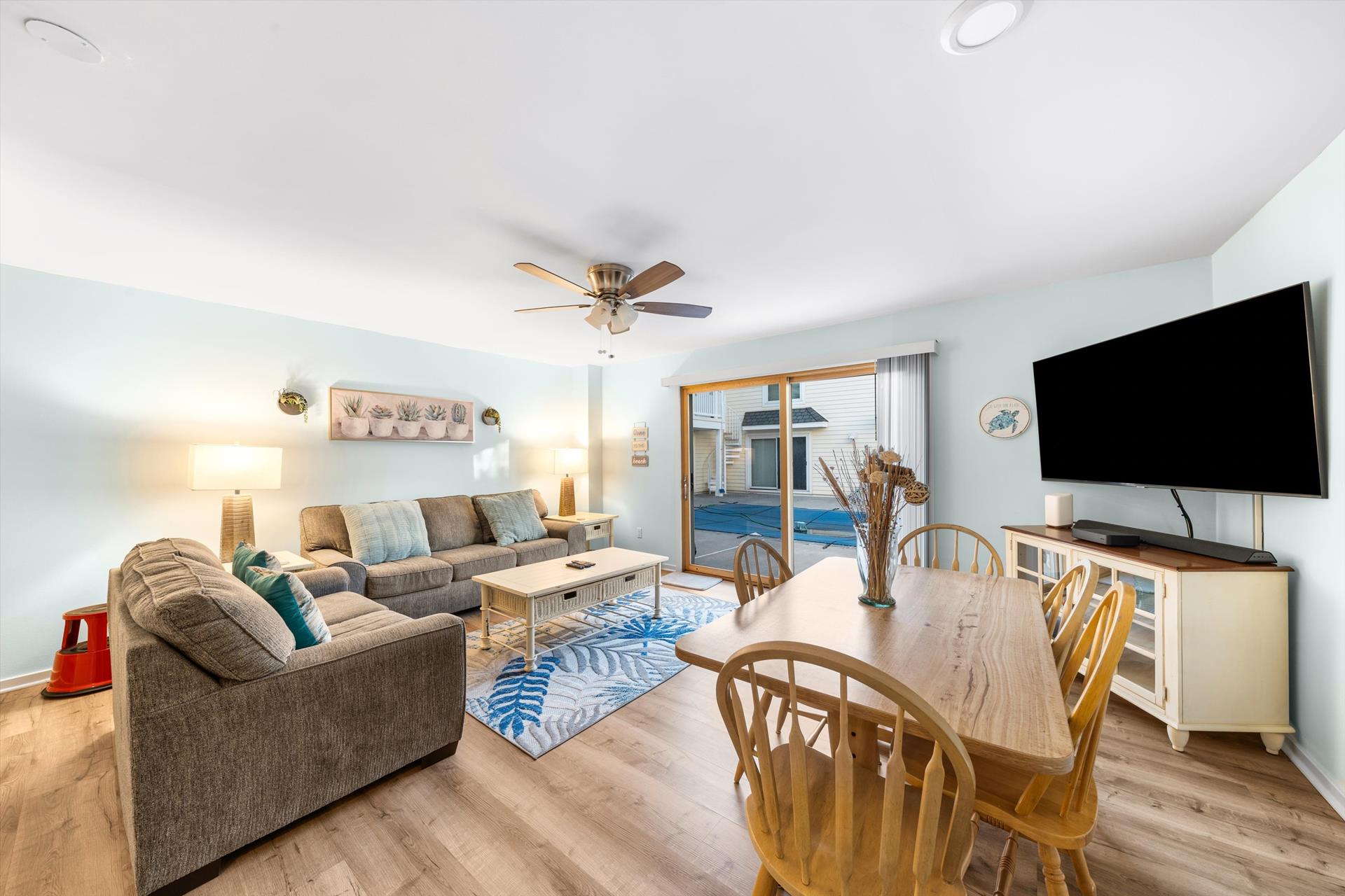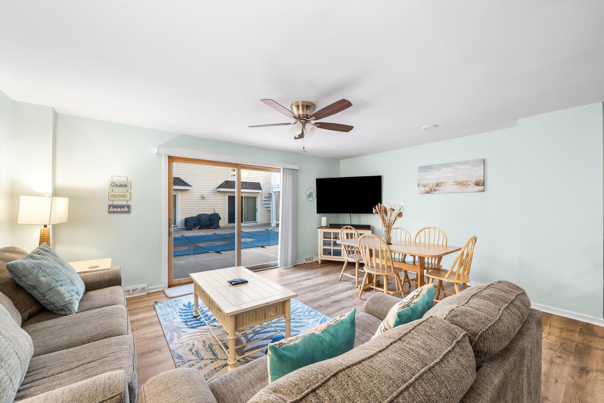 Stone Harbor Gardens Unit 4. This 3 bedroom 2 bath condo with a pool provides everything you need for a great week at the beach. Convenient location puts you within walking distance of the beach and all the attractions at 80th Street as well as the 96th Street shopping district. The condo features a bedroom on the first floor. The main living area and kitchen on the second floor which opens to the shared pool and courtyard. The third floor features and additional 2 bedrooms with shared hall bath. The unit features 1 off street parking space and the owner provides 6 beach tags and 4 beach chairs for your convenience. Call us today to reserve your week. Owner will entertain off season and weekend rentals with a 2 night minimum.